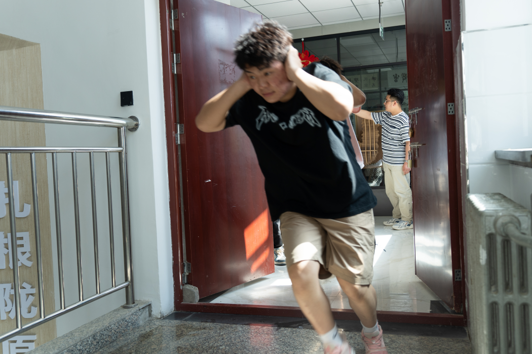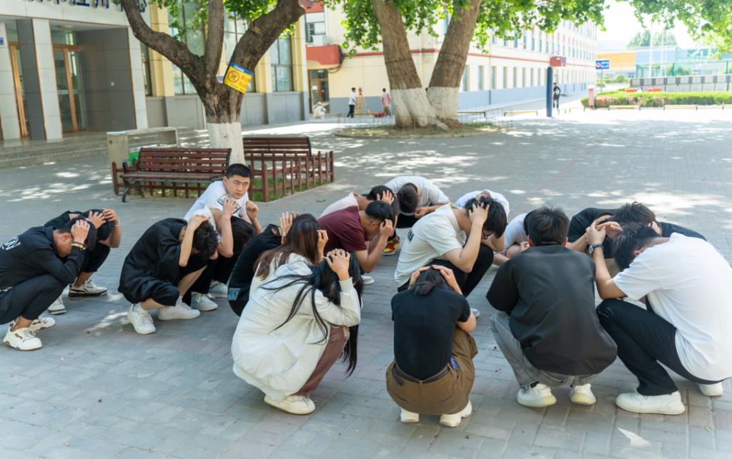 演练在学院的精心策划和周密安排下,按照预定的计划和流程顺利进行。演练开始前老师向园区各工作室成员普及了地震发生时的自我保护知识,包括“桌下避震、门框支撑”等基本的自救动作。随后,随着预警铃声的响起,演练正式开始。教师们迅速引导学生采取保护措施,同学们或蹲或卧,利用课桌等坚固物体进行防护。在短短的“地震”过后,师生们按照预定路线迅速有序地疏散到学校操场的安全区域。